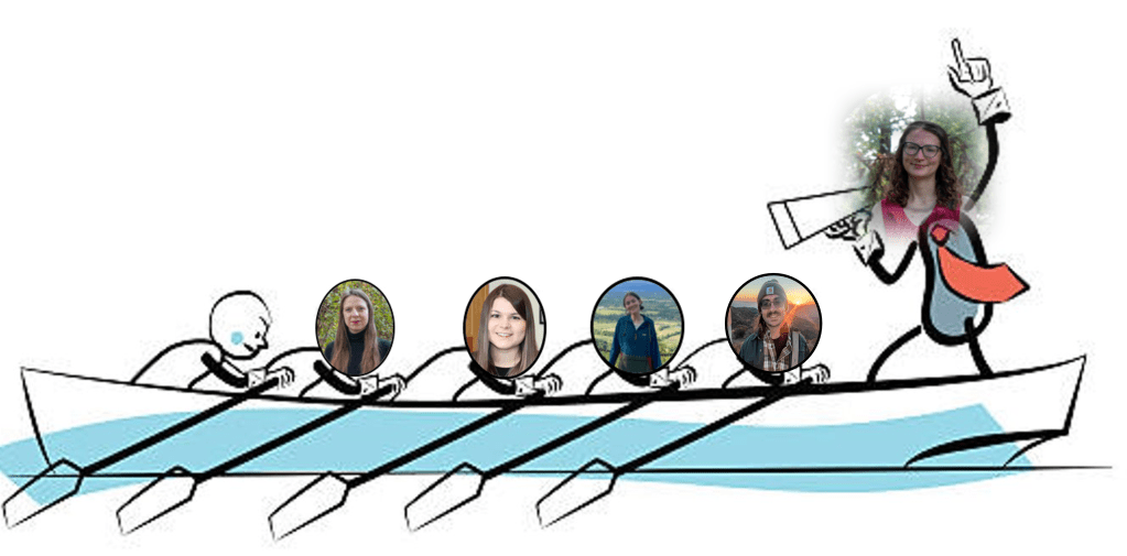 “Group Photo” with current Reinhardt lab members as of 1/2026. From left to right, the crew members are Agnieszka Stańczak, Morgan Reik, Amelia Bradecamp, Mitch Nelson, and the coxswain/PI Clorice Reinhardt.