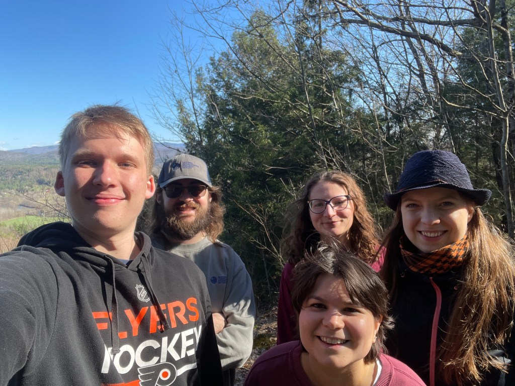 April 2026 Reinhardt lab photo (our first “official” group photo!) from our group hike around the Catamount Center in Williston. Pictured from left to right are Reinhardt group members Justin Barrer, Mitch Nelson, PI Clorice Reinhardt, Morgan Reik, and Agnieszka Stańczak.“Group Photo” with current Reinhardt lab members as of 1/2026. From left to right, the crew members are Agnieszka Stańczak, Morgan Reik, Amelia Bradecamp, Mitch Nelson, and the coxswain/PI Clorice Reinhardt.
